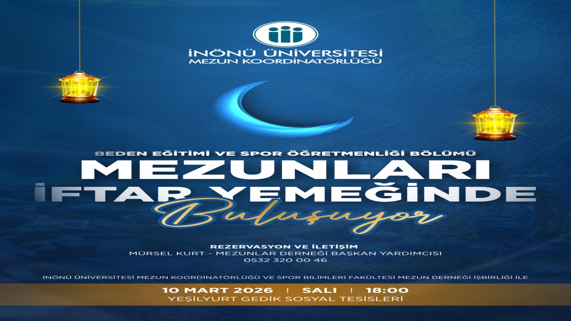 İnönü Üniversitesi Mezun Koordinatörlüğü ve Spor Bilimleri Fakültesi Mezun Derneği iş birliğiyle, Beden Eğitimi ve Spor Öğretmenliği Bölümü mezunları için iftar programı düzenlenmektedir.